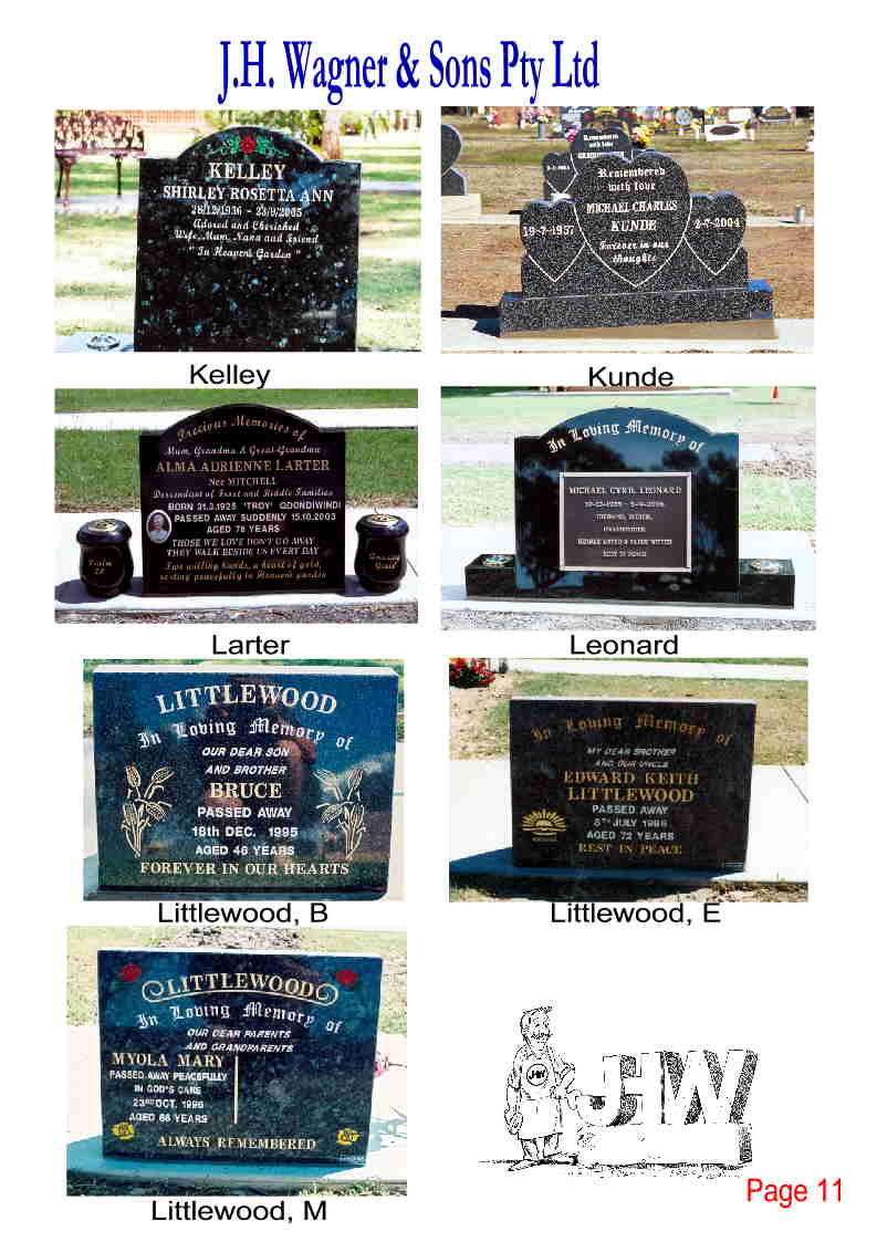 With a total of 23 pages of photographs demonstrating headstones which are suitable for the Goondiwindi (lawn) Cemetery we understand the choices may be daunting, however at J.H. Wagner & Sons we also aim to provide the very best of options and personalised service to assist with the selection that best suits your needs.